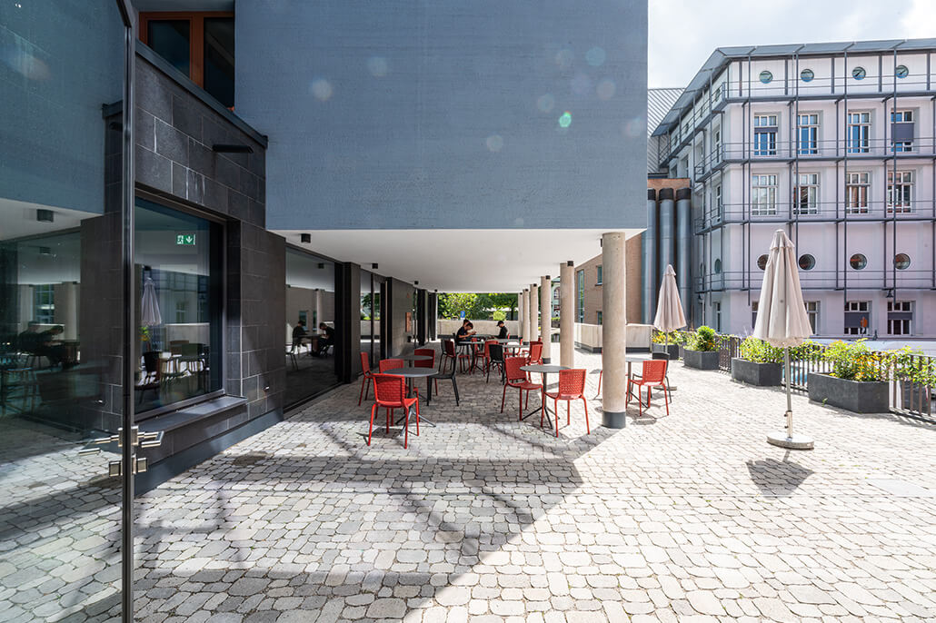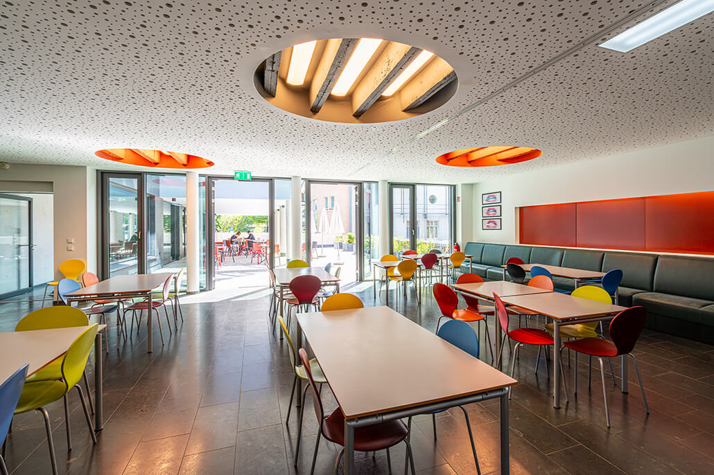 Allen, die möchten, bieten wir an, in einem erfrischend bunten Speiseaal bei uns zu Mittag zu essen.
